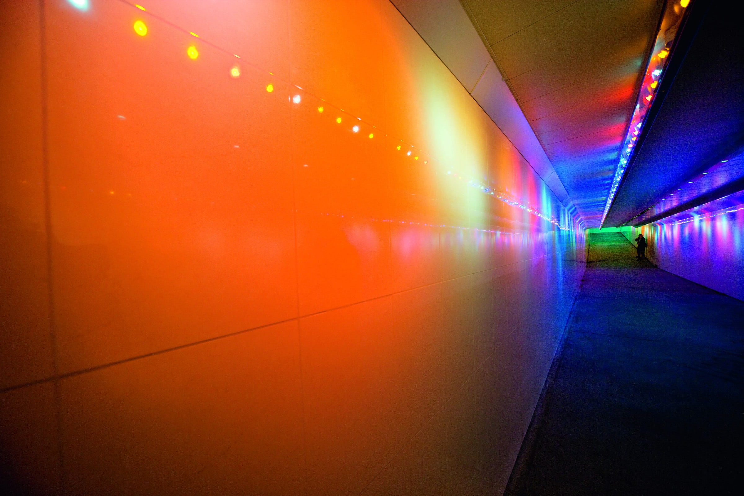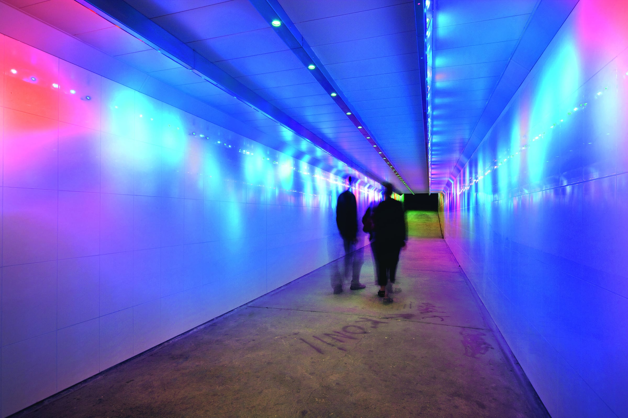 The concept for immerse uses long life, LED each with specific lenses housed in a small, tamper proof housing which runs the length of the underpass passage. The projection of light across the ceiling and down the walls creates the visual equivalent of an impressionist “painting” through which the pedestrian passes.