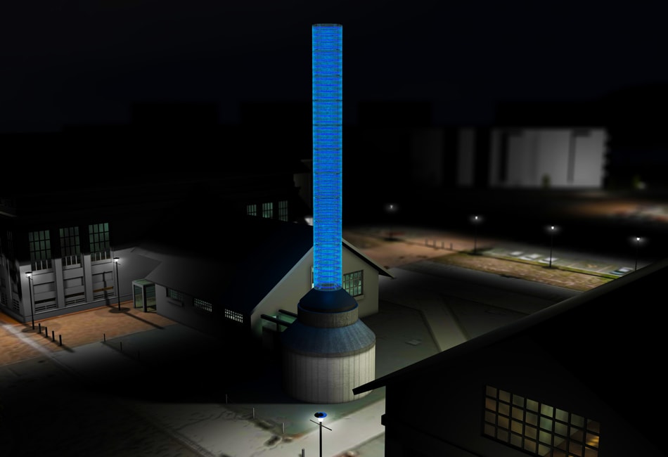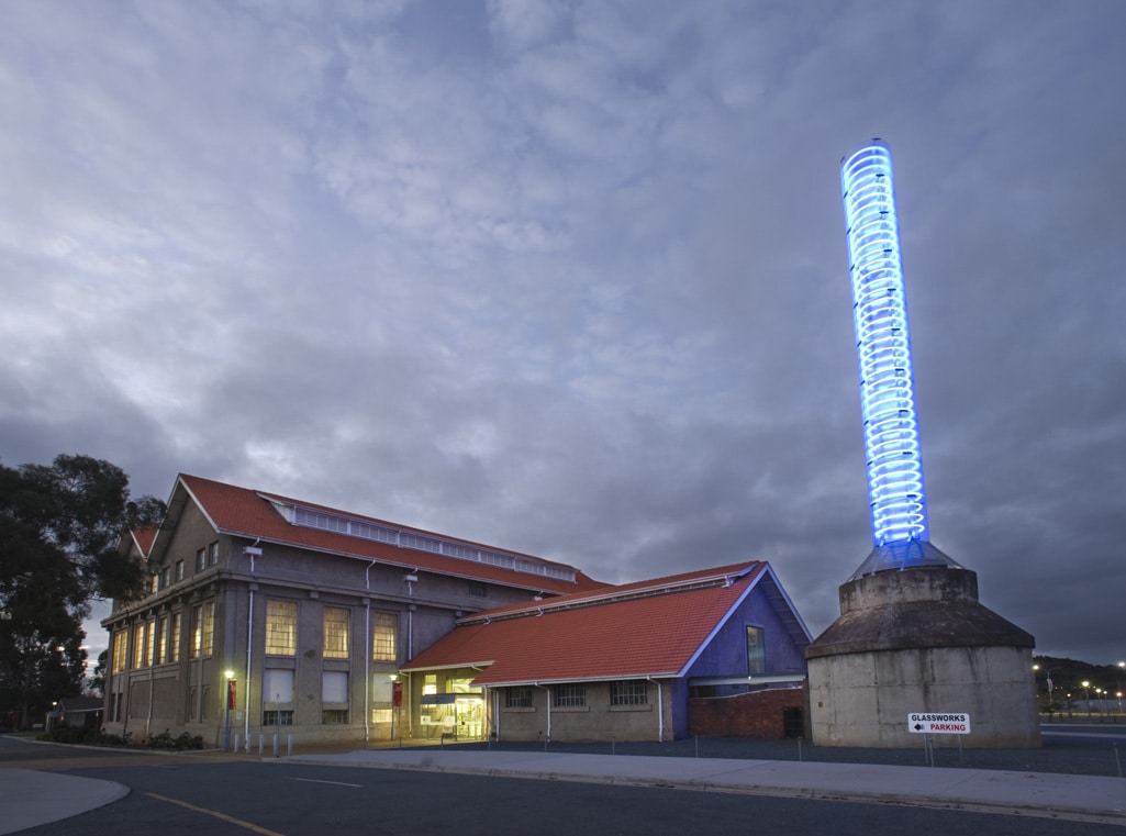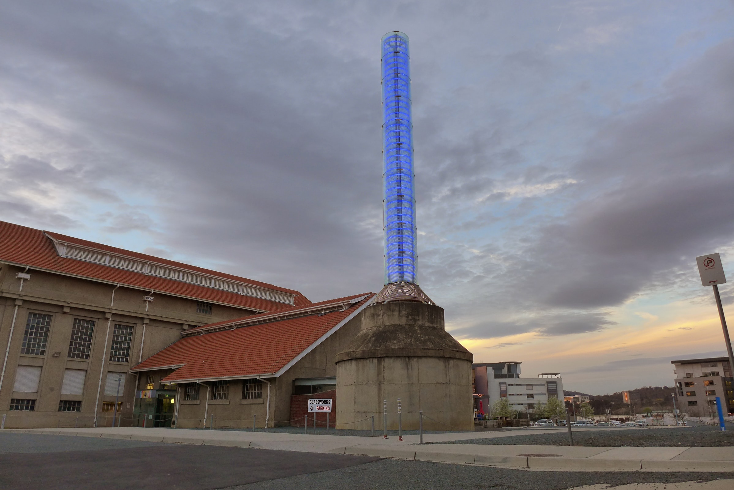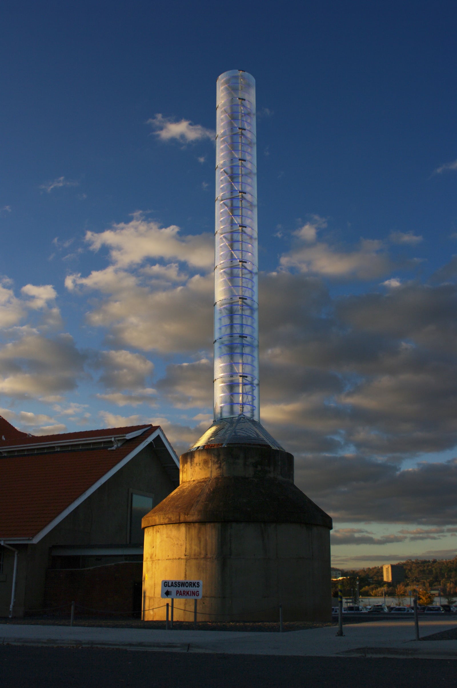Currently the site of the Canberra glassworks this 23m tall shimmering pillar (chimney) of glass references both the past and present usage of the site. The building originally served as the Kingston Powerhouse.